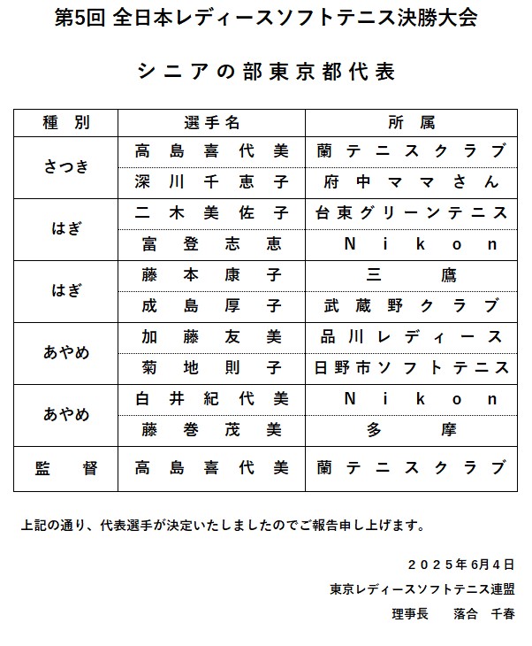 令和7年 第5回 全日本レディース ソフトテニス決勝大会 シニアの部 代表